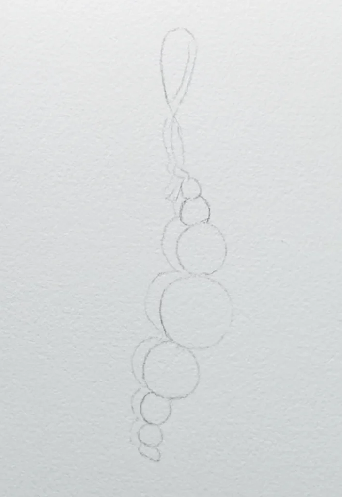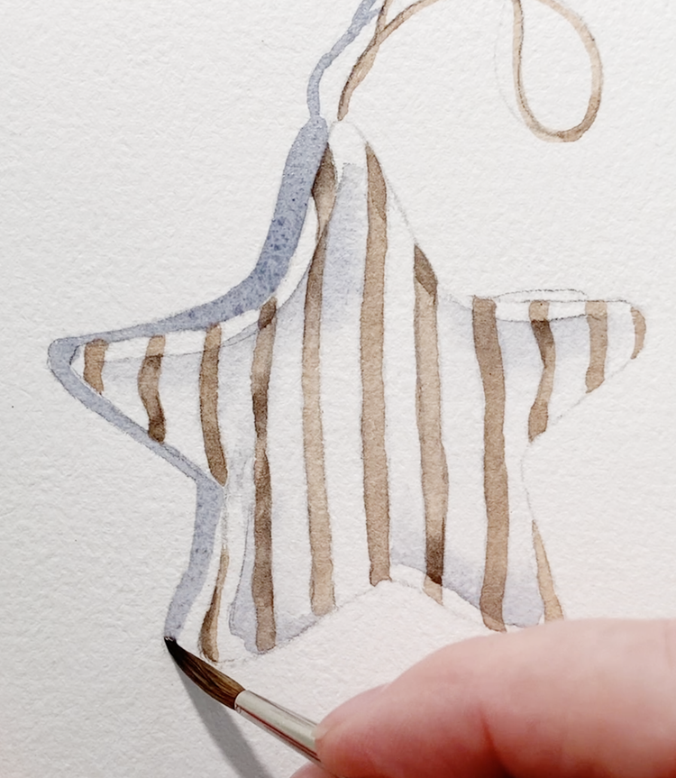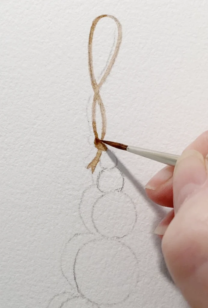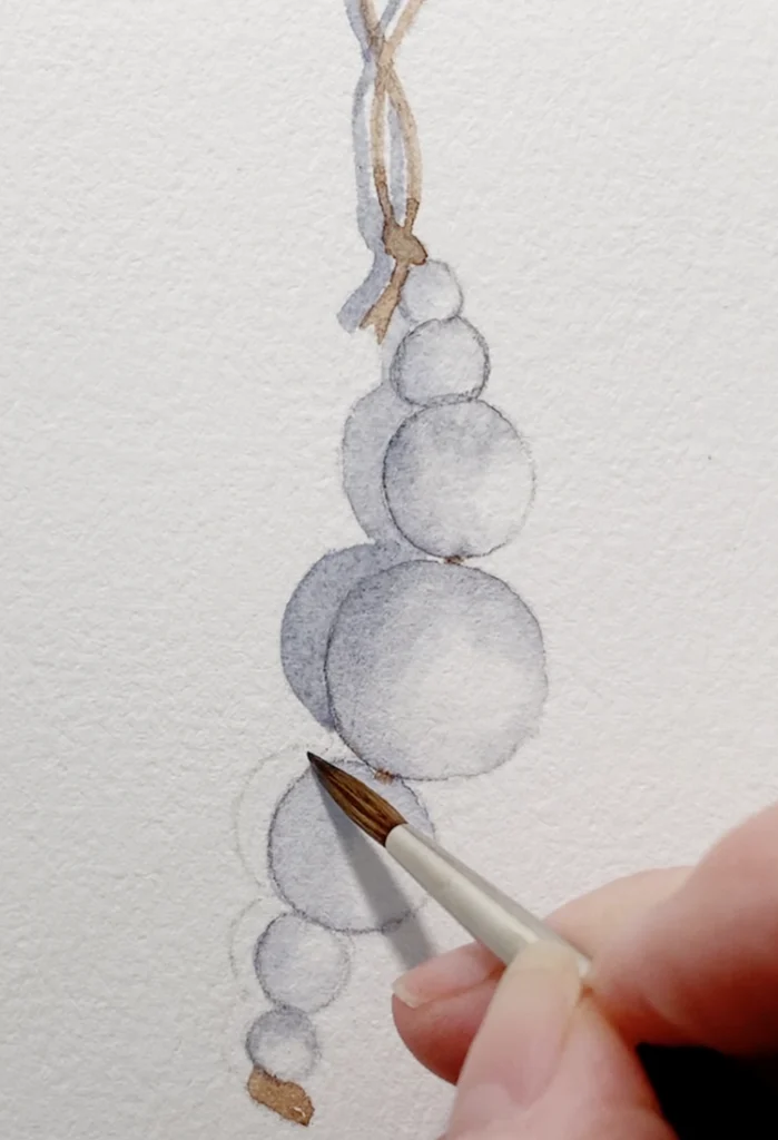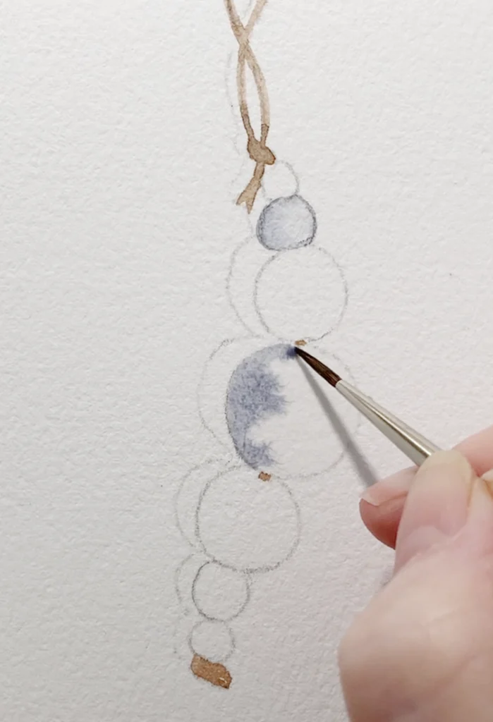 Using the gray mixture you have left, it’s time to paint the cast shadow behind the string and beads. This is what really makes the ornament “pop” off the page!