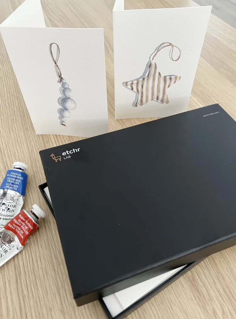 Paper: Etchr cold-pressed greeting cards (100% cotton, 300 gsm). The card fronts are about 4 x 6 inches (10.5 × 15 cm).