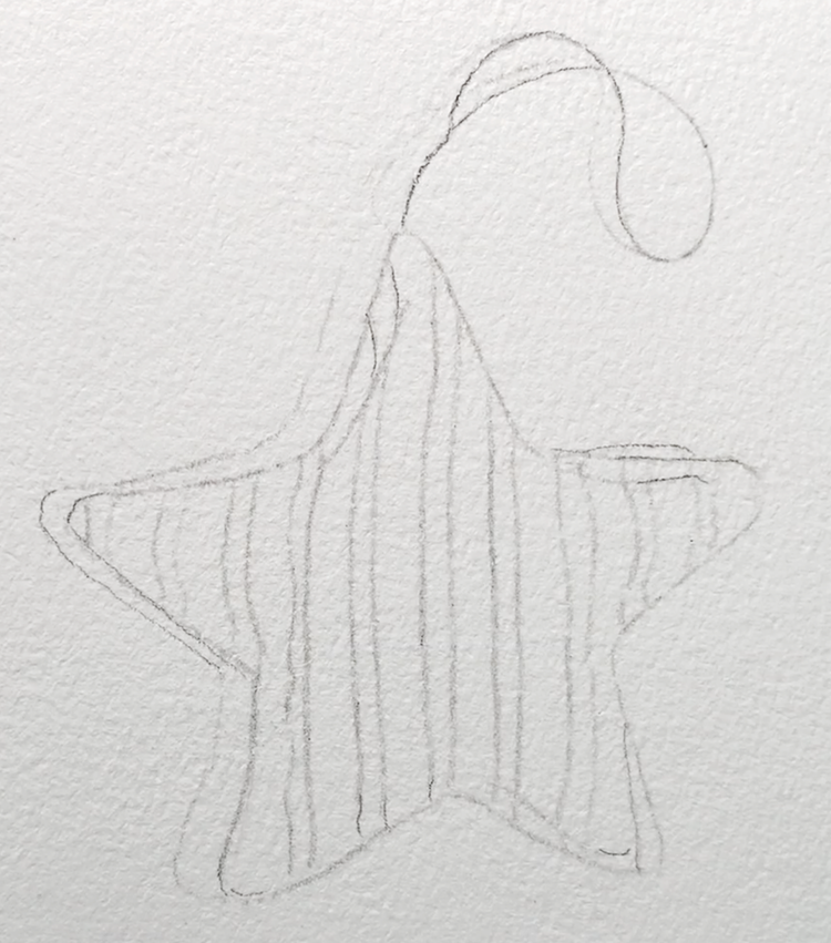For our first painting, lightly sketch a simple star shape on the front of your card. Keep your pencil marks very light so they are barely visible. Inside the star, draw a smaller line that runs parallel to the inner edge. This little “seam” is what gives the star its soft, stuffed-fabric look later on!