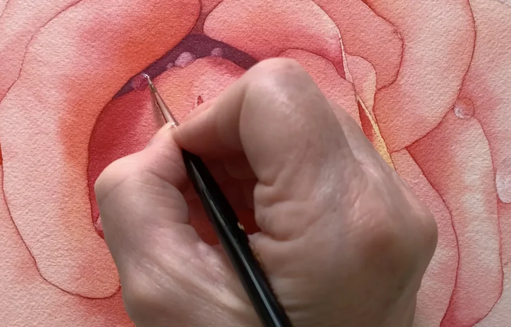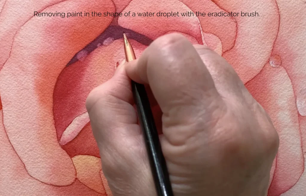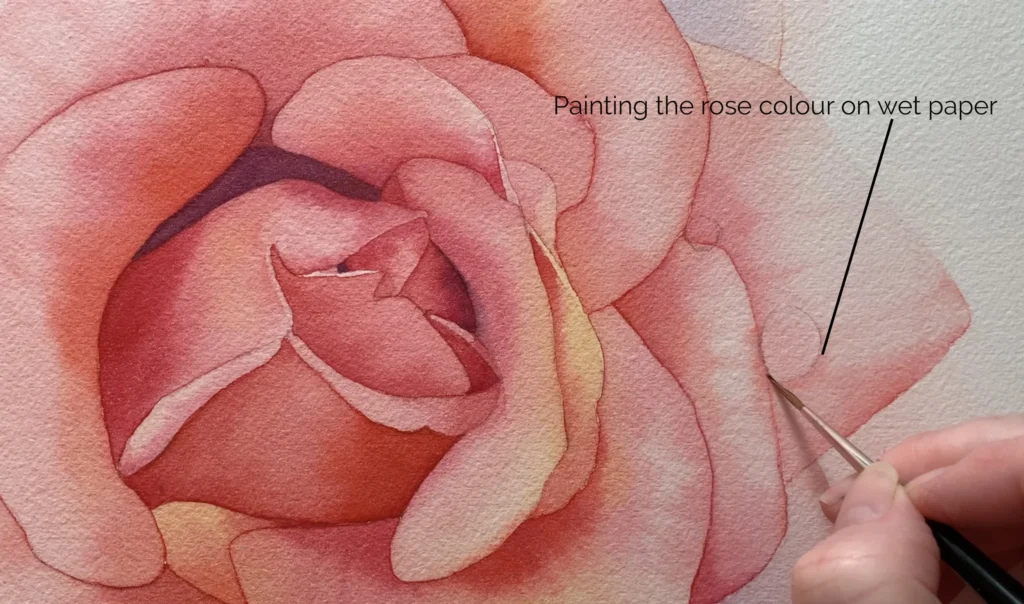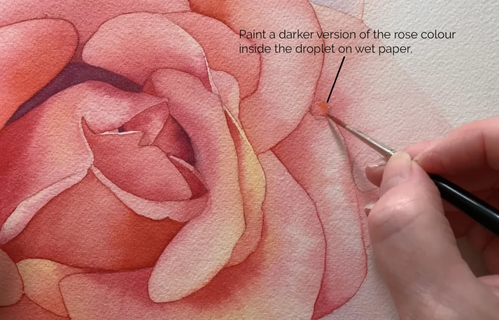 A small brush adds a darker version of the rose colour inside a droplet shape on wet paper, enhancing depth and realism.