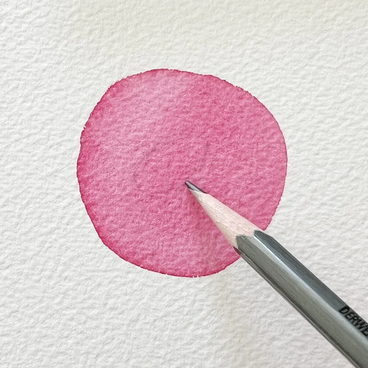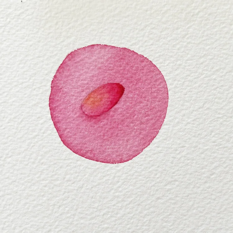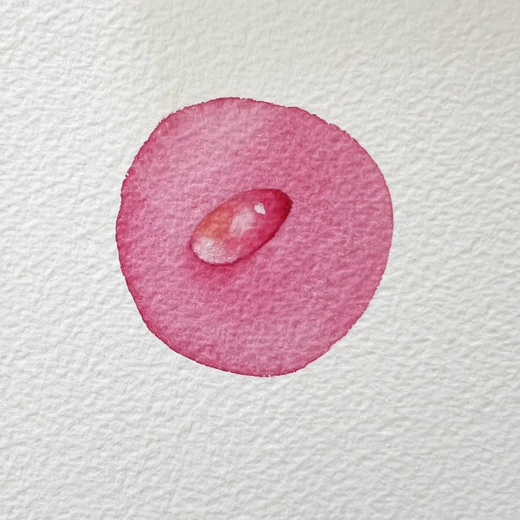 Paint a simple shape in watercolor and let it dry completely (I used Ruby Red – PV19). Once it’s dry, lightly draw a single water droplet shape onto the colored area.