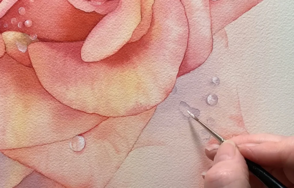 After scattering a few more droplets across the petals, I decided to step away. It’s always tempting to keep going, but too many droplets can overwhelm a painting. A thoughtful selection adds freshness and interest without distracting from the beauty of the rose itself.