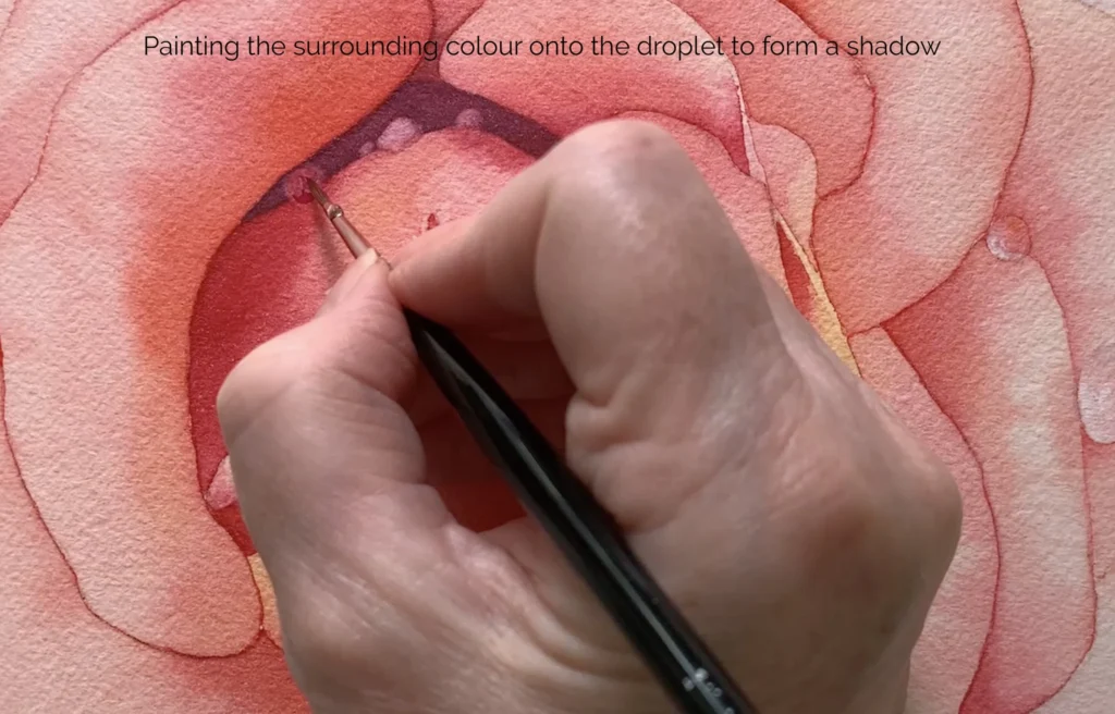 Here I’m painting the cast shadow around the outside edge of the droplet using the same colour I used for the rose petal.